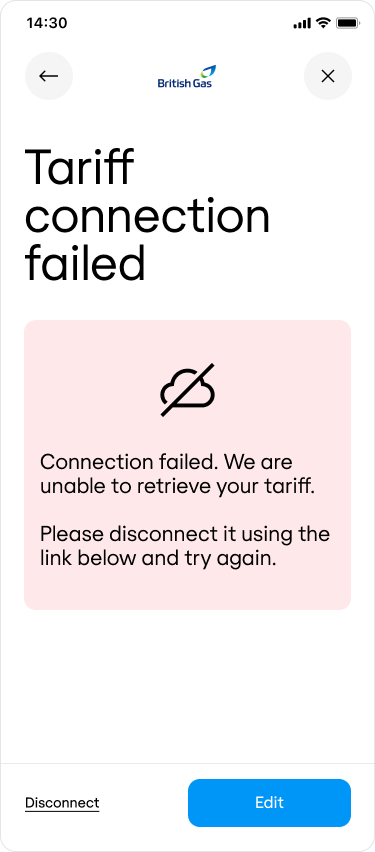 Informs the customer that the tariff connection has failed.