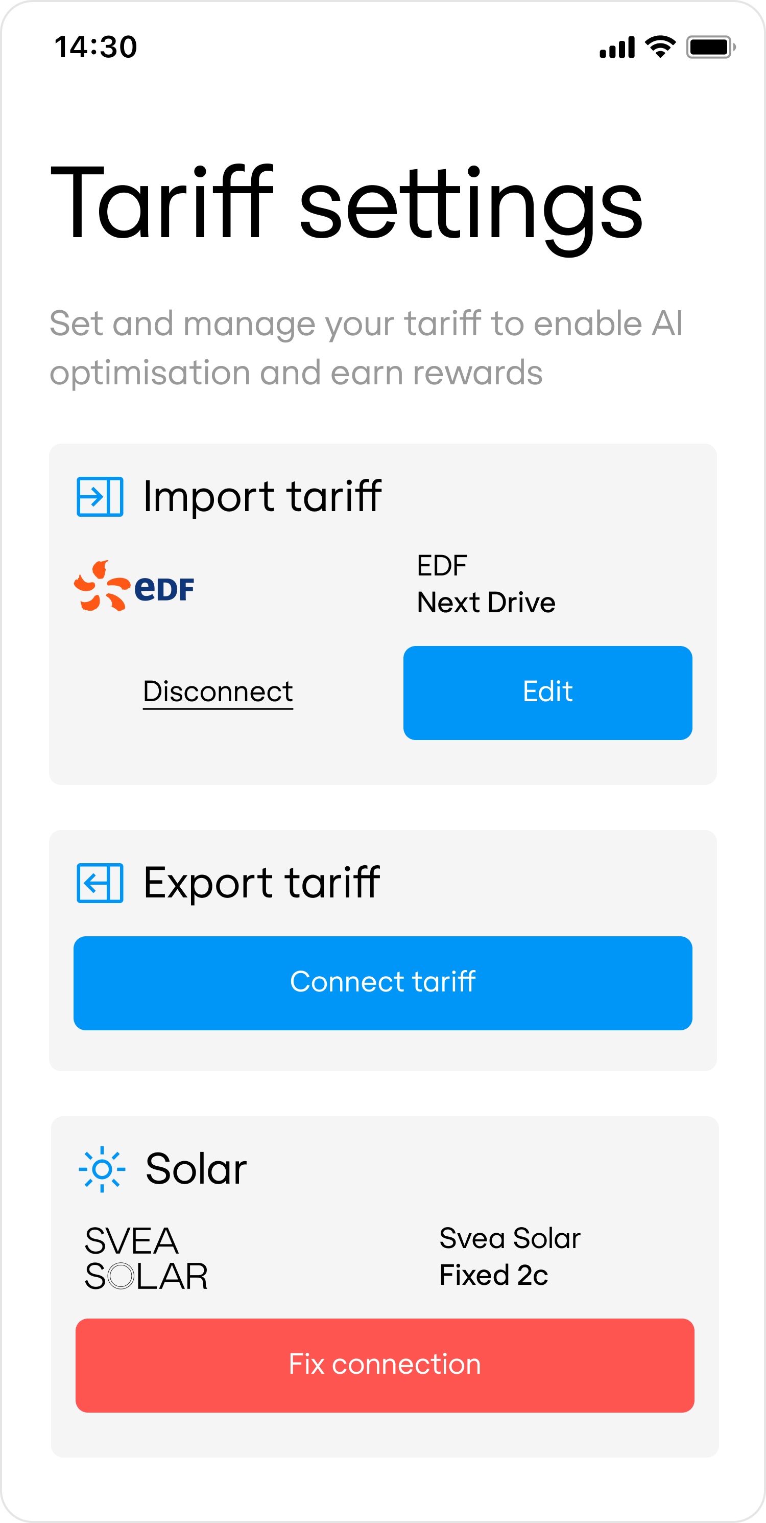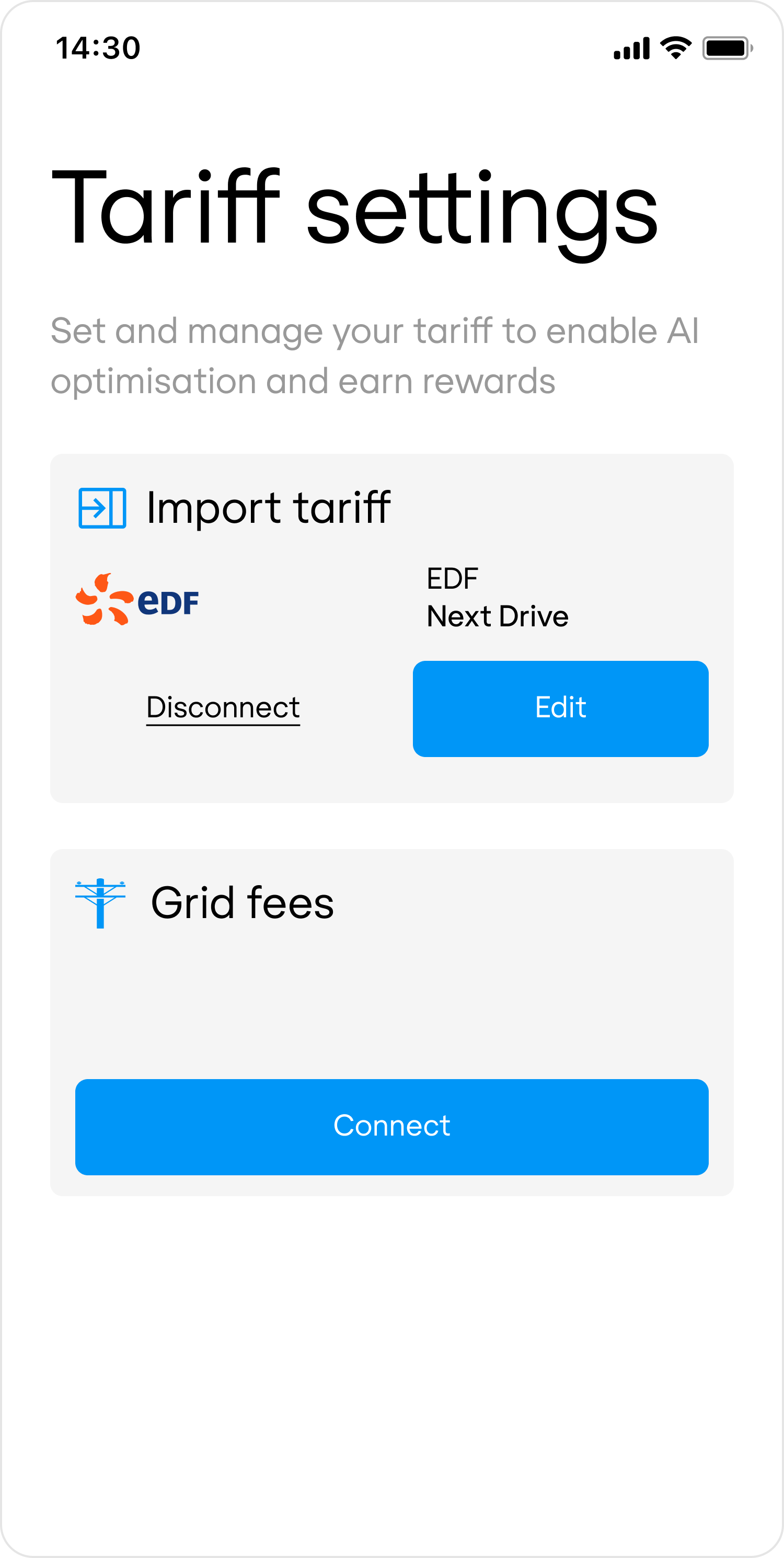 To allow customers to view, update, or disconnect their tariff, your app must first display their current tariff connections. To do this, call the retrieve-location-status endpoint.Use the response to populate the configuration of your Tariff Connection Page in your app: